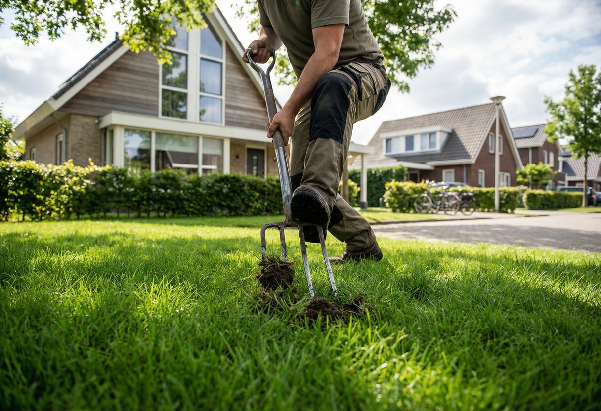 Aëren klinkt chic, maar met een tuinvork of riek kom je al een heel eind. Steek de tanden elke 10-15 cm in de grond, tot zo’n 10-20 cm diep, en geef de vork een kleine draai zodat de grond loskomt. Werk in een ruitpatroon en pak vooral looproutes en dunne plekken mee. Het is even doorzetten, maar je ziet snel verschil: de bodem veert weer en plassen trekken sneller weg.